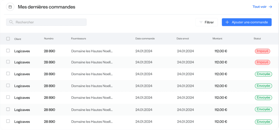 Simplifiez votre processus de commande. Créez, suivez et gérez facilement toutes vos commandes clients. Automatisez les notifications aux fournisseurs et obtenez une visibilité en temps réel sur l'état des commandes.